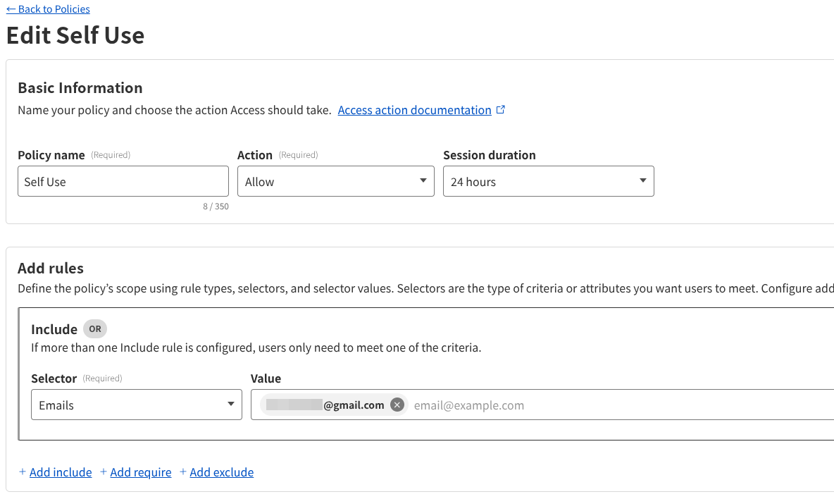 ※ここでは例として自分のメールアドレスだけをincludeに設定したSelf Useというポリシーを設定(適宜Access policies · Cloudflare Zero Trust docsなどを参照願いたい)